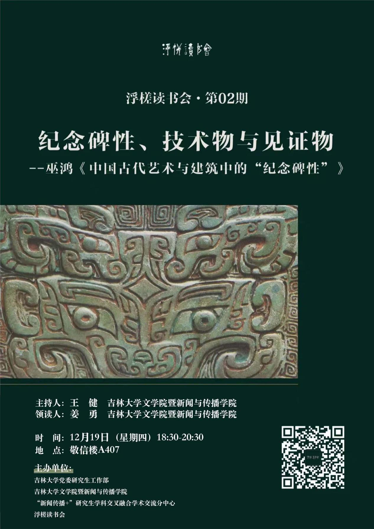暨新闻与传播学院、“新闻传播+”研究生学科交叉融合学术交流分中心、浮槎读书会共同主办。拟邀请姜勇教授,领读巫鸿经典著作《中国古代艺术与建筑中的“纪念碑性”》,围绕“纪念碑性、技术物与见证物”展开探讨。