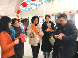 十楼四周挂着红色的灯笼,抬头向上望去,来自十一楼的气球传递着欢乐,伴随着灵动的音乐,迎新年茶话会从有趣的猜谜开始。大厅周围一条条彩色纸带上写着谜语,书法字体优美,而解谜更吸引着教职工的好奇心。