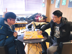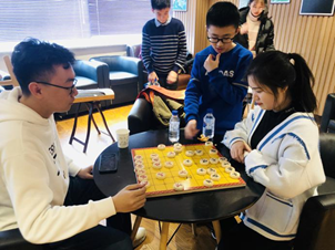 随后,大家或在大厅中边吃小食边唠家常、说趣事、谈人生;或在书画室内撰写新年对联,互送福字,谈诗作对,其乐融融;或到咖啡屋里,下着象棋、围棋、五子棋,打着扑克牌,轻松惬意。