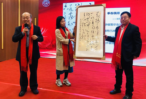 校友、安徽师范大学教师孙炜峰主持,孙炜峰和广电系副主任张芳馨共同朗诵马大勇教授创作的诗歌《母校,故乡》。