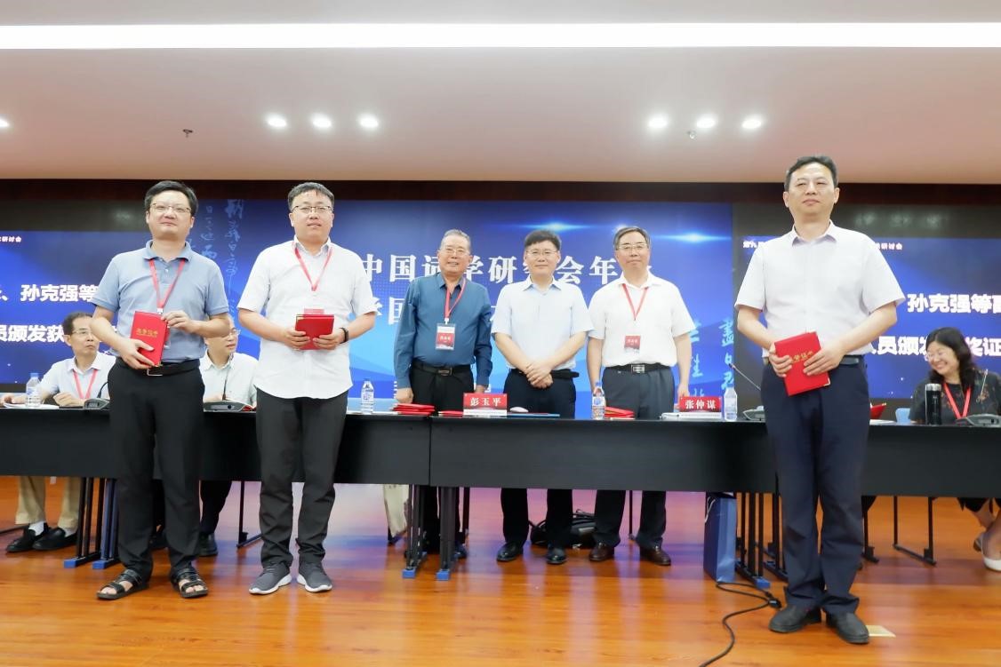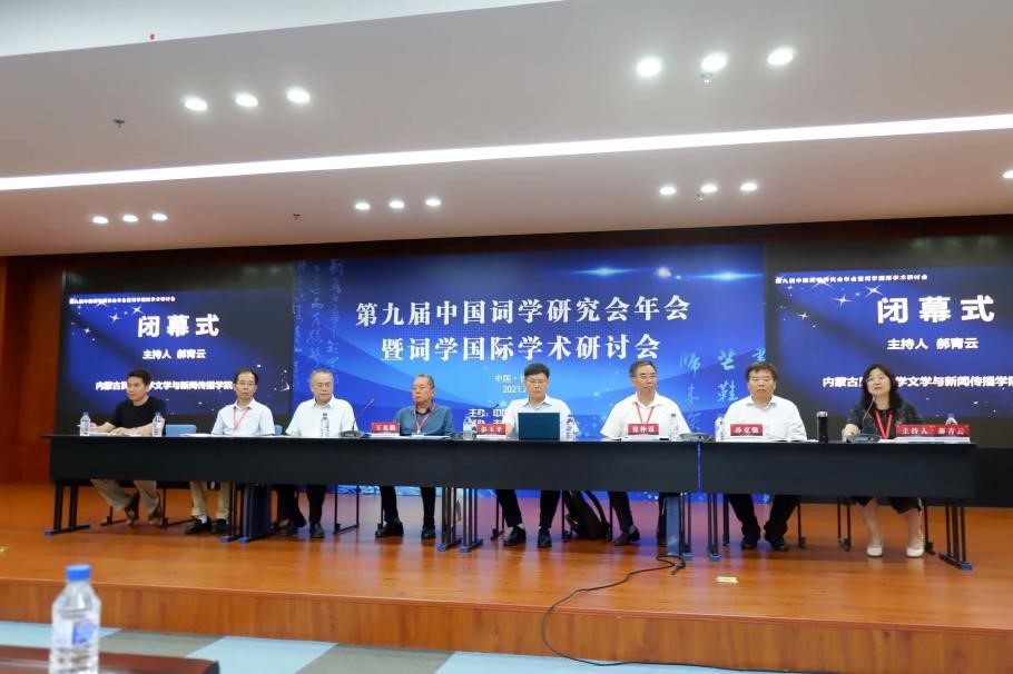 7月18日下午的闭幕式由内蒙古民族大学文学与新闻传播学院院长郝青云教授主持。首先,三个小组的汇报人分别代表本组汇报了两天的研讨成果;彭玉平教授对本次词学会进行了全面而精彩的学术总结,彭教授指出,词学研究应注意理论与文献的结合、关注研究对象的特殊性、秉持客观与理性的精神、遵循逻辑与体系的认知、在自然明晰地表达学术观点的同时注意文字的美感。嗣后的颁奖环节,词学会张仲谋副会长与陈水云秘书长分别宣读本届词学会优秀论文获奖人员名单与第七届夏承焘词学奖获奖人员名单,并由王兆鹏会长,孙克强、张仲谋、彭玉平等副会长为获奖人员颁发获奖证书;本届词学会为澳门大学教授施议对先生颁发了夏承焘词学终身成就奖,施议对先生以视频形式发表了获奖感言。最后,下届词学会承办方代表江苏师范大学教授沙先一教授致辞欢迎词学专家至徐州共襄盛会,李静教授代表91制片厂
