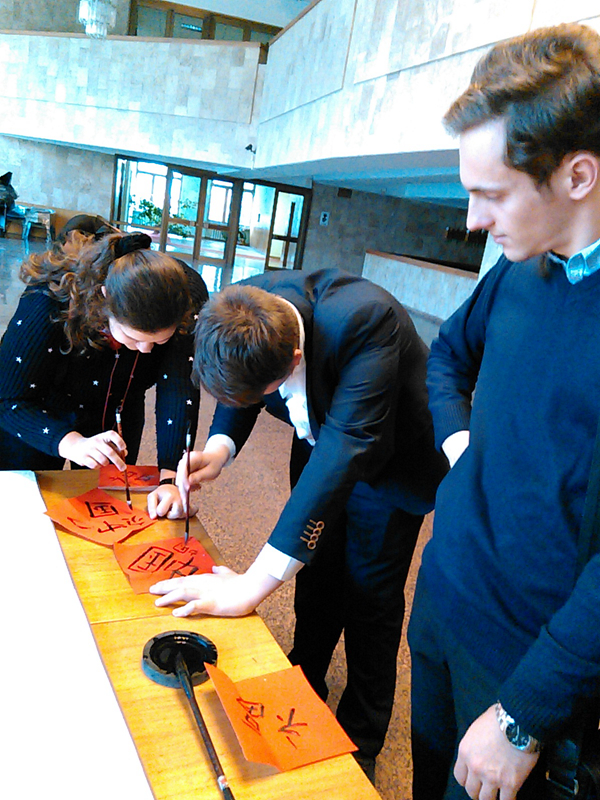 由兴波老师还参加了基辅国立塔拉斯·舍甫琴科大学孔子学院的系列文化活动,为孔子学院的学生做了《中国书法》的专题讲座;参加了基辅国立塔拉斯·舍甫琴科大学国际关系学院举办的“中国文化周”开幕式,现场展示了中国书法创作,与乌克兰艺术家进行了文化交流活动,引起了参加活动的嘉宾、学生对中国文化的极大兴趣。