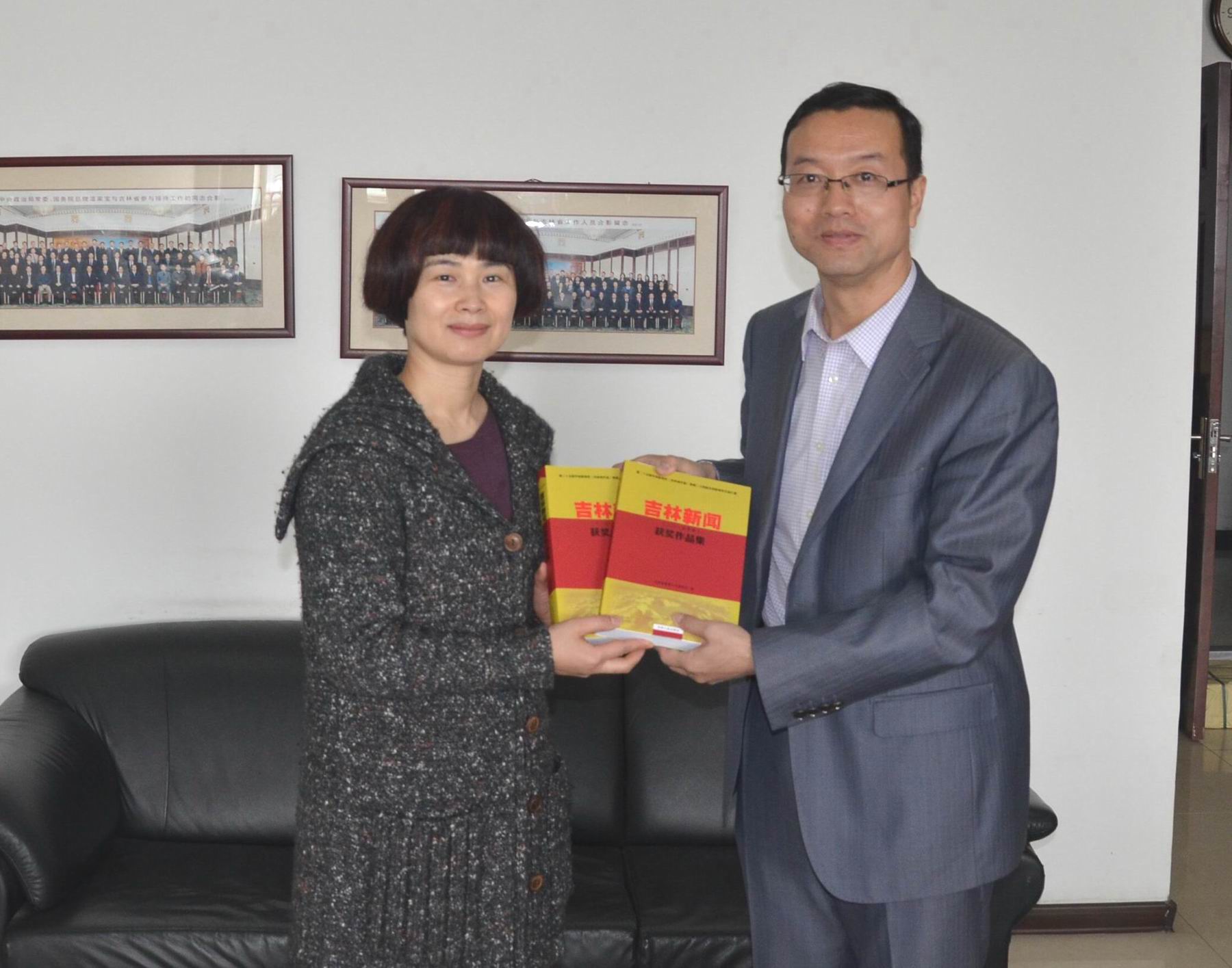 新闻与传播学院赠送了42册《吉林新闻获奖作品集(2015年卷)》。《吉林新闻获奖作品集(2015年卷)》是由吉林省新闻工作者协会策划、组织和编辑,是吉林省第一次把年度获奖新闻作品汇编成册,该书集中收录了吉林省新闻界2014年优秀新闻作品,其中全文收录第二十五届(2015年)中国新闻奖吉林省获奖作品3件、吉林新闻奖一等奖作品111件,另将吉林新闻奖二、三等奖获奖作品篇目列表收录,这些作品代表了全省新闻工作者的突出业绩成果,记录了吉林省改革开放和经济社会的发展脚步,也是新闻教学与研究的优秀素材。图为吉林省新闻工作者协会秘书长胡莺(左)向91制片厂