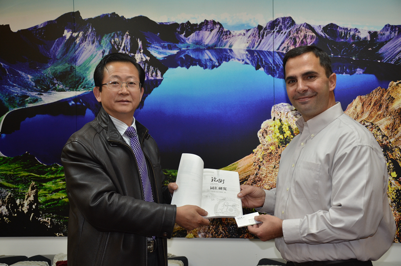 DSC_4322.JPG:徐正考院长向唐纳德•W•赫尔姆副教授赠送自己的学术专著《< 论衡>词汇研究》。