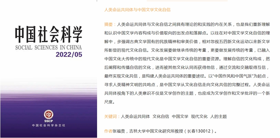哲学社会科学资深教授张福贵在《中国社会科学》2022年第5期发表文章《人类命运共同体与中国文学文化自信》。