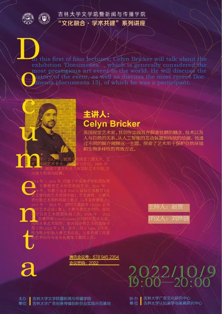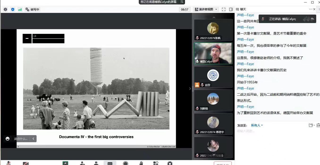 认知美学与美育研究中心协办的“文化融合·学术共建”国际学术讲座活动邀请了英国视觉艺术家Celyn Bricker在线做了题为《卡塞尔文献展(Documenta)》的英文学术讲座。本次讲座以线上形式进行,由传播系国际传播教研室主任赵贺副教授主持,刘晔骁副教授评议。相关专业老师、在读本科生及硕士研究生共100余人参与了此次活动。