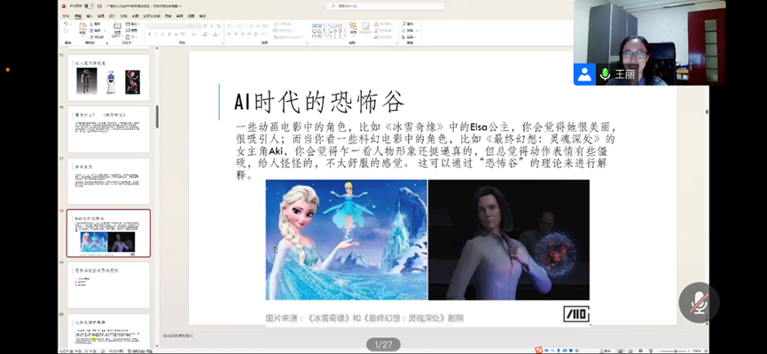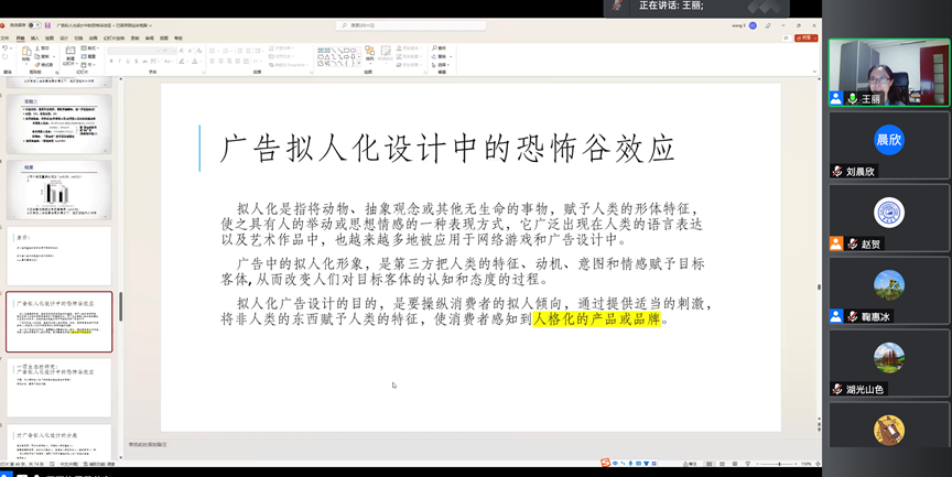 王丽教授此次的分享从“媒介是人的延伸”和“设计拟人化”两个理论角度切入。她首先列举了“整容脸”和“麦当劳小丑”两个贴近生活的现象,从类人特征和拟人特征角度解读了目前热门的“虚拟数字人”的发展趋势。进而详细地阐述了恐怖谷、认知失调、共情抑制等理论,从而导入“拟人化广告设计中的恐怖谷效应”这一主题。