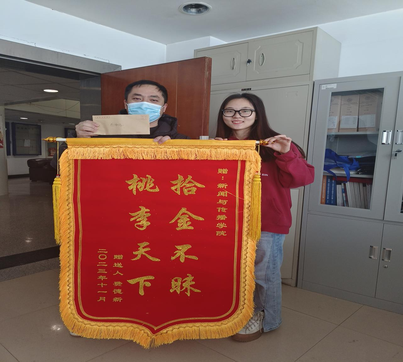 2021级新闻学专业刘邢同学在学校附近捡到一个装有银行卡、身份证、现金两千余元,各种票据数张的钱包。她第一时间用钱包中的名片联系到失主,将钱包归还。