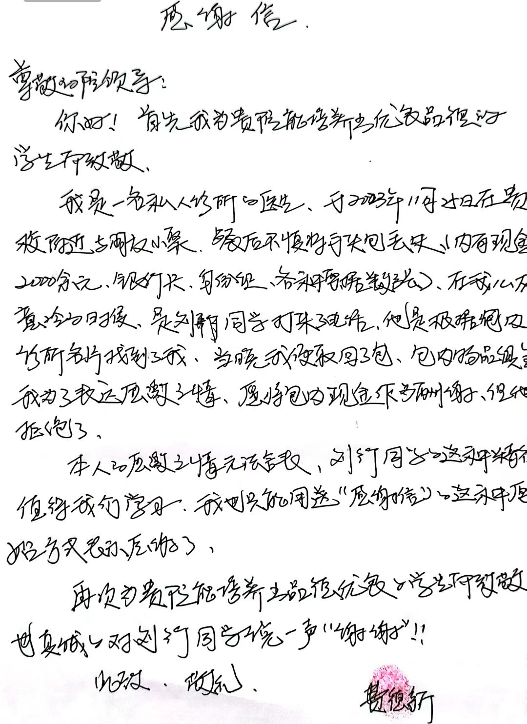 暨新闻与传播学院学生工作办公室门口,他手中拿着一面锦旗、一封感谢信,来院对学生本人及学院的培养表达感谢。辅导员杨佳欣老师立即停下手中的工作前来接待。在交谈中了解到,失主费医生于11月25日和朋友在我校附近小聚,畅谈到下午四点多。由于晚高峰打车困难,费医生步行了一段路才乘出租车回到诊所。到诊所后才发现自己的钱包不见了。不记得车牌号的失主费先生惊慌失措,正值心灰意冷的时刻,91制片厂