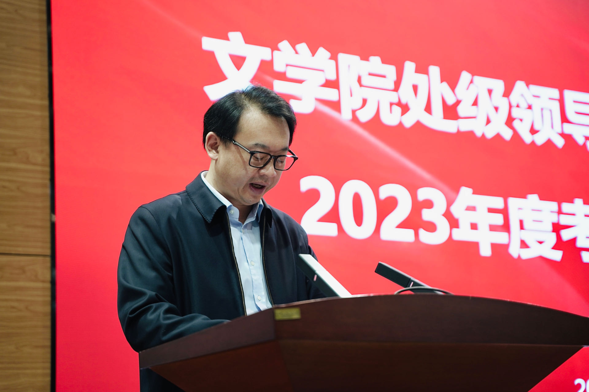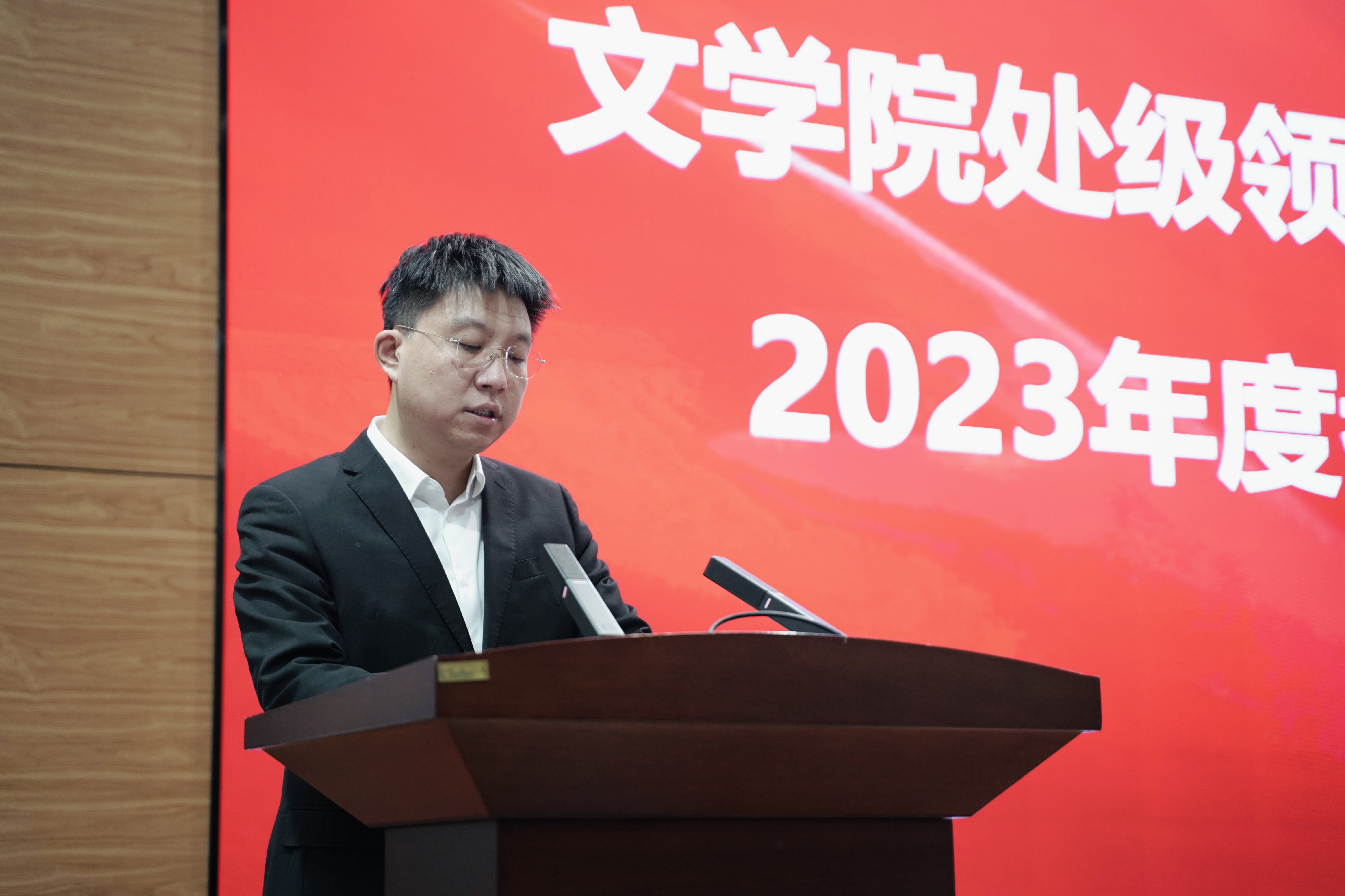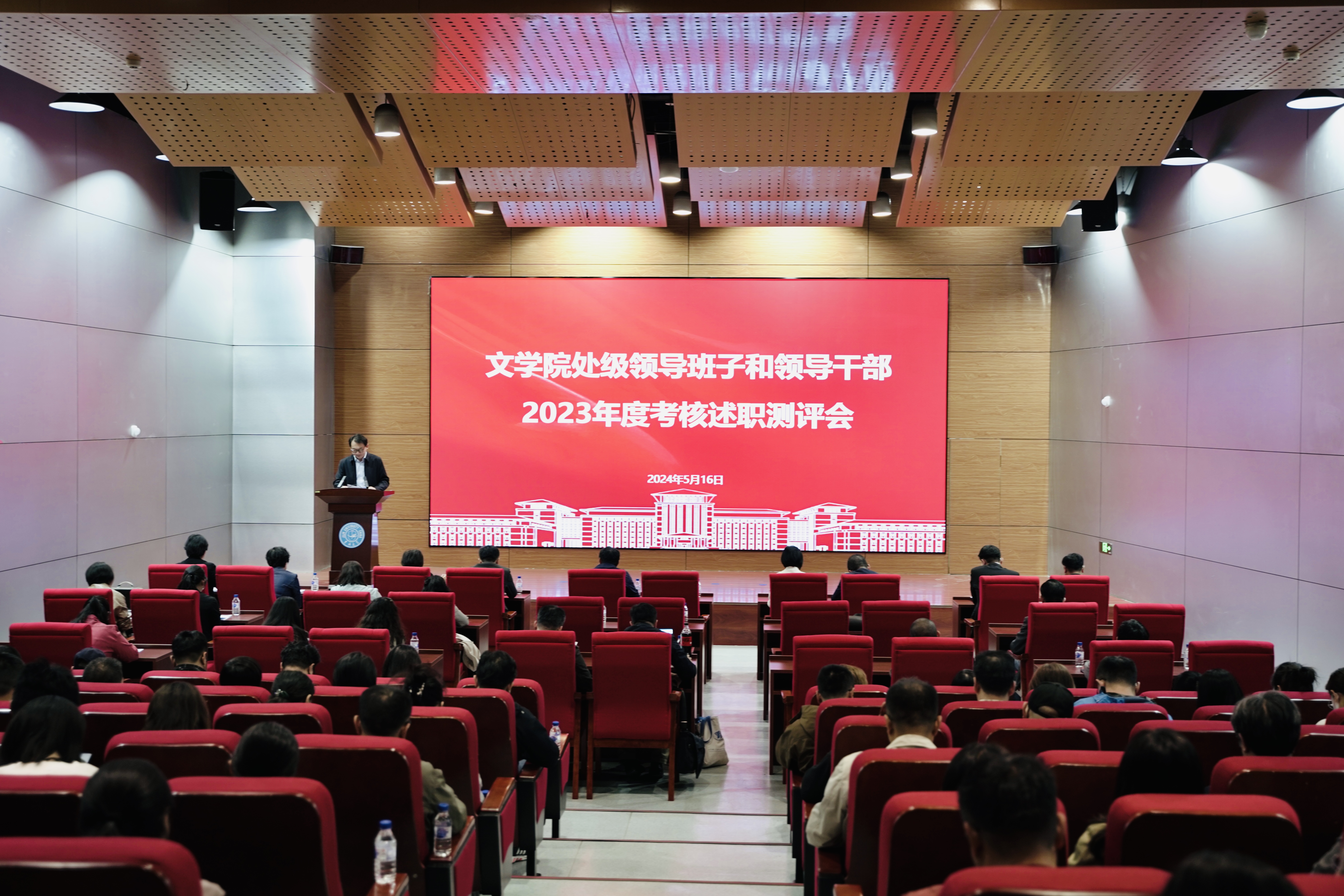 暨新闻与传播学院在中心校区国际大讲堂召开处级领导班子和领导干部2023年度考核述职测评会,学院全体教职工参加会议,会议由党委副书记兼纪委书记刘卓主持。