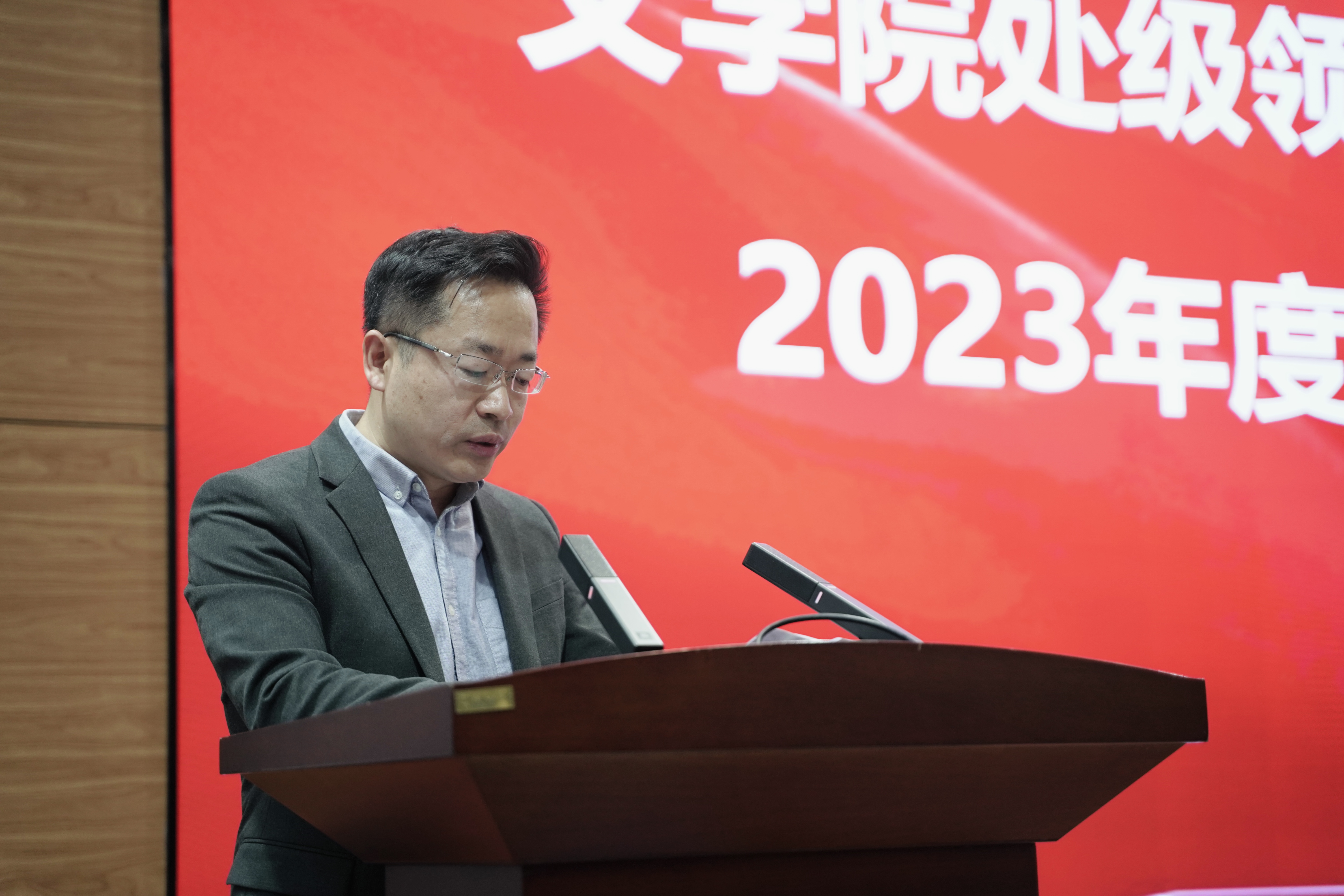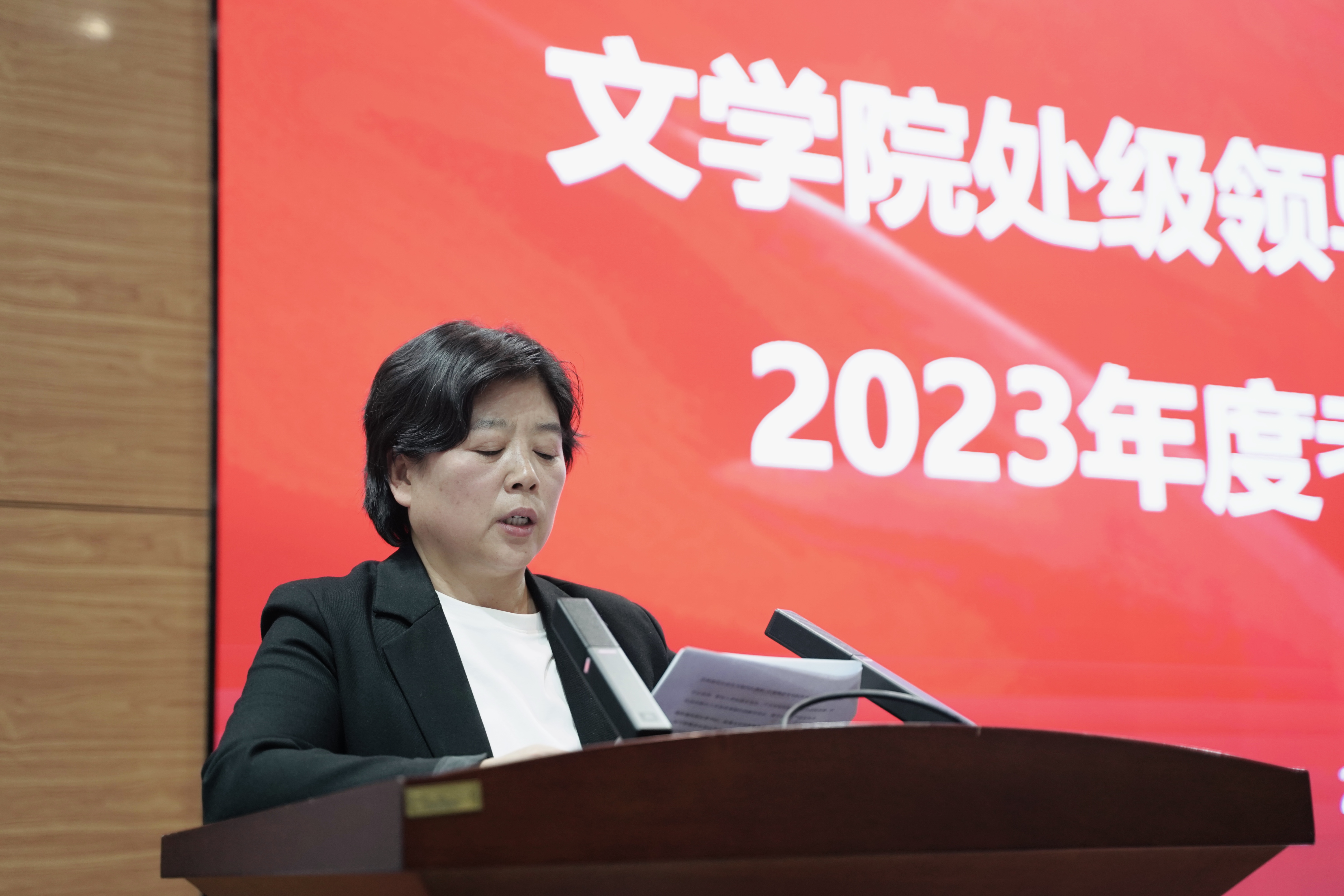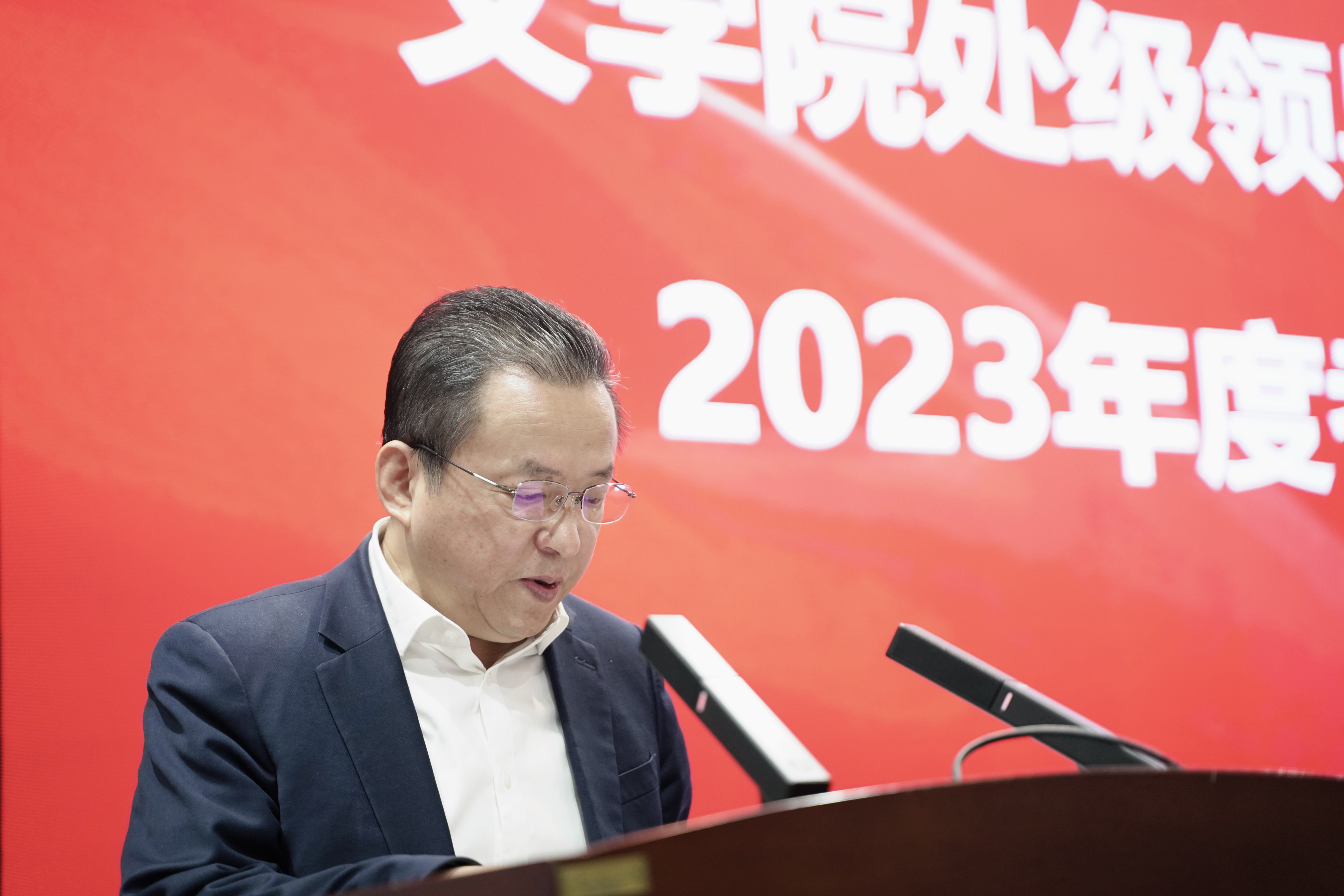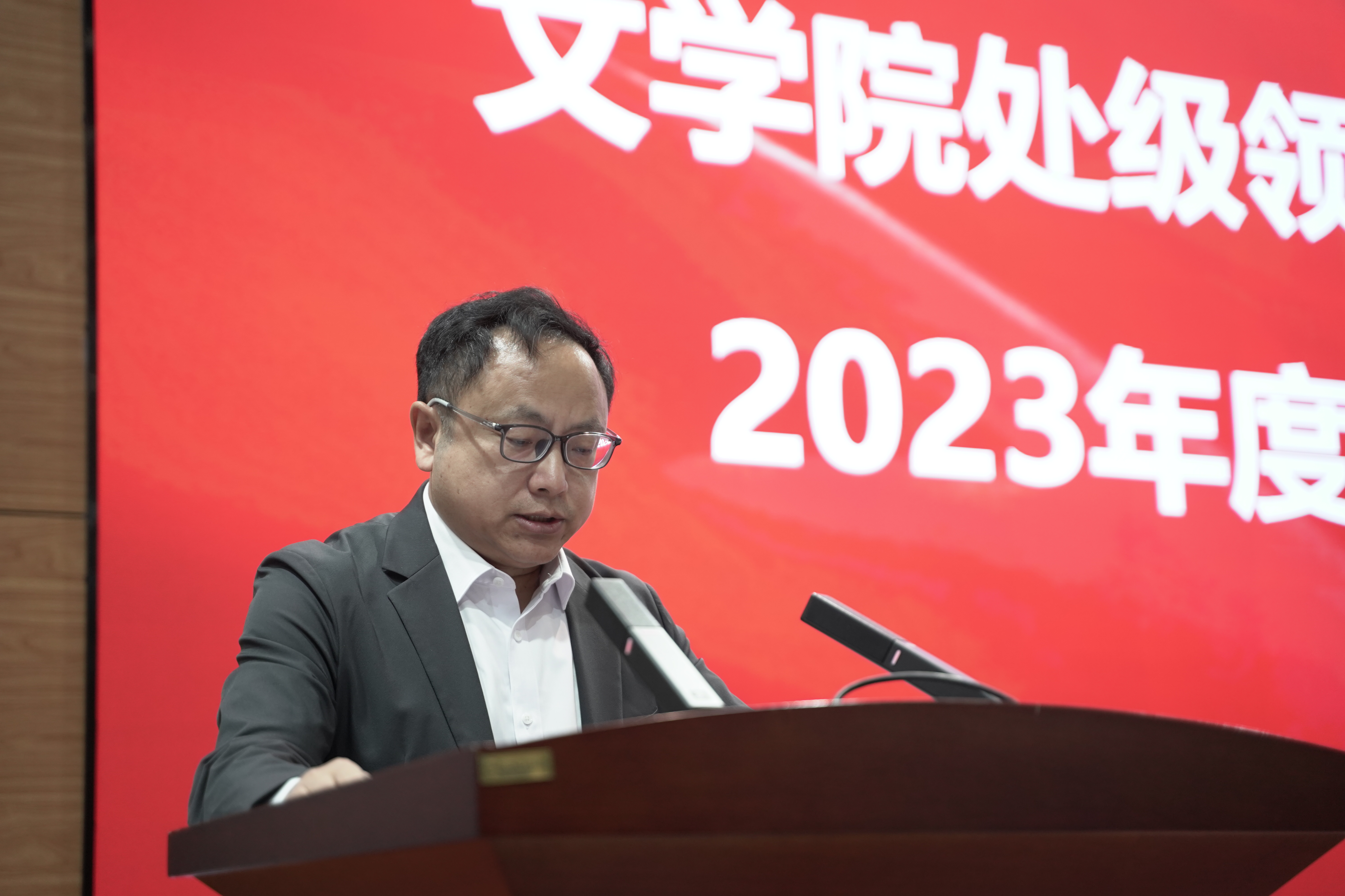 暨新闻与传播学院在中心校区国际大讲堂召开处级领导班子和领导干部2023年度考核述职测评会,学院全体教职工参加会议,会议由党委副书记兼纪委书记刘卓主持。