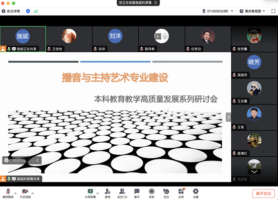 10月12日,广播电视艺术系全体教师在线开展了以“建设具有核心竞争力的国家级一流本科专业”为议题的本科教育教学高质量发展研讨会。会上广电系教师围绕媒介生态跃迁与播音主持人才培养目标“升级”、构建支撑国家级一流专业建设的教学核心内容、建立符合本学科本专业教育特点的教学体系等问题展开了热烈讨论。最后老师们还热切表达了专业成长和终身学习的必要性。表示教师自身应树立勤学笃行、求是创新的躬耕态度;教学单位要搭建同行间交流经验的平台,定期组织研讨会、沙龙,邀请国内外知名学者分享最新研究成果;还应支持教学科研立项,鼓励教师开展与当前热点相关的课题研究;加强与产业界的联系,鼓励教师参与联合研发项目,丰富教学内容,践行真正的开放办学。