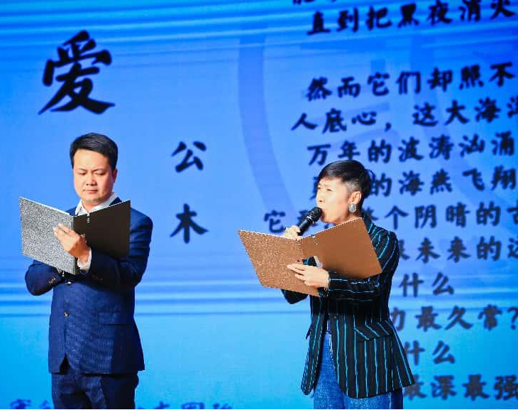 暨新闻与传播学院播音系教授曲海红和02级播音系校友刘派以壮美深情的声音朗诵了公木先生的《我爱》,致敬北上先生们携来的诗歌精神。