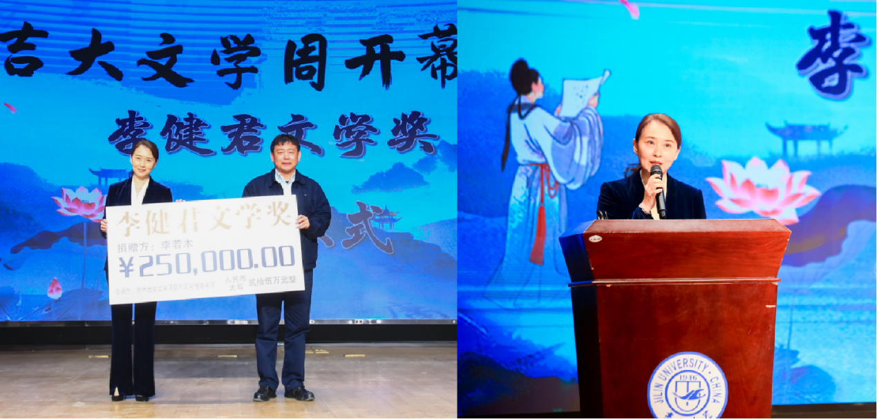外语系95级校友李若木在文学周开幕活动中捐赠人民币25万元设立了“李健君文学奖”,该奖项将专项扶持学生文学创作,首批获奖作品预计于年末揭晓。现场领导、嘉宾、师生、校友观看了李健君先生生平短片,表达了对这位文坛先达的缅怀和致敬之情。李若木女士发表感言,对吉大学子的文学创作寄予厚望。