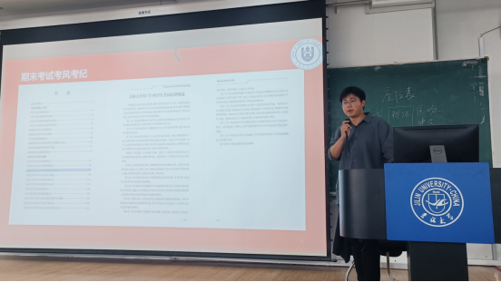 暨新闻与传播学院2022级辅导员王振彰老师主持的2022-2023学年第2学期年级大会在第三教学楼第九阶梯教室召开。