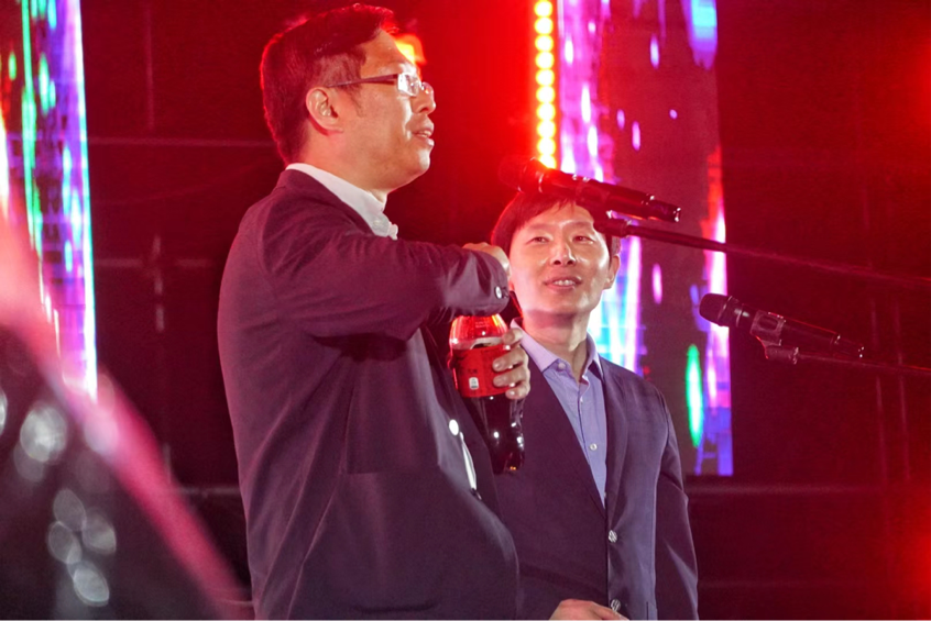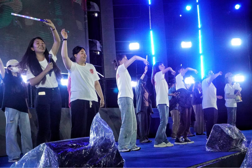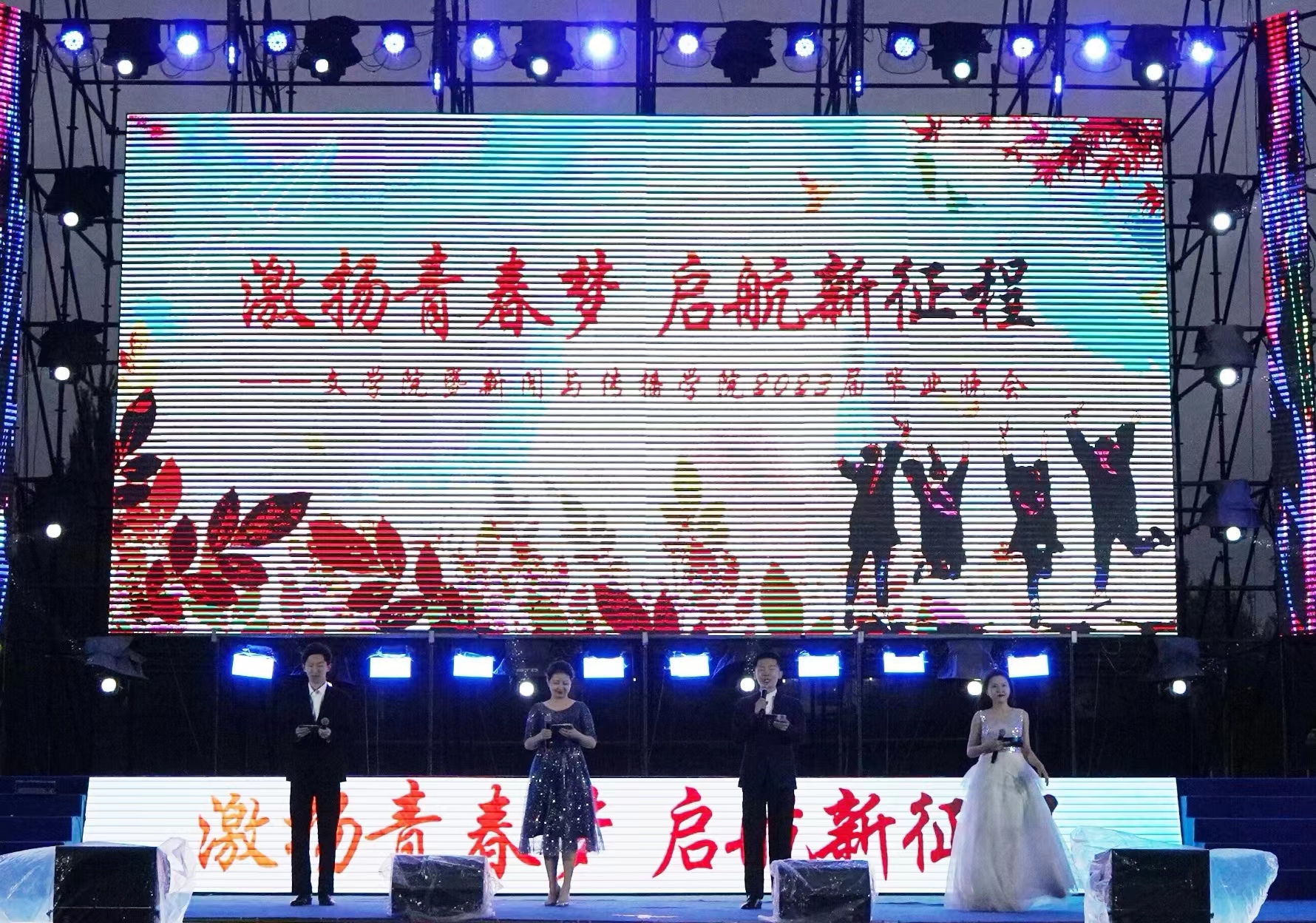 暨新闻与传播学院2023届毕业晚会在中心校区田径场上准时开始。