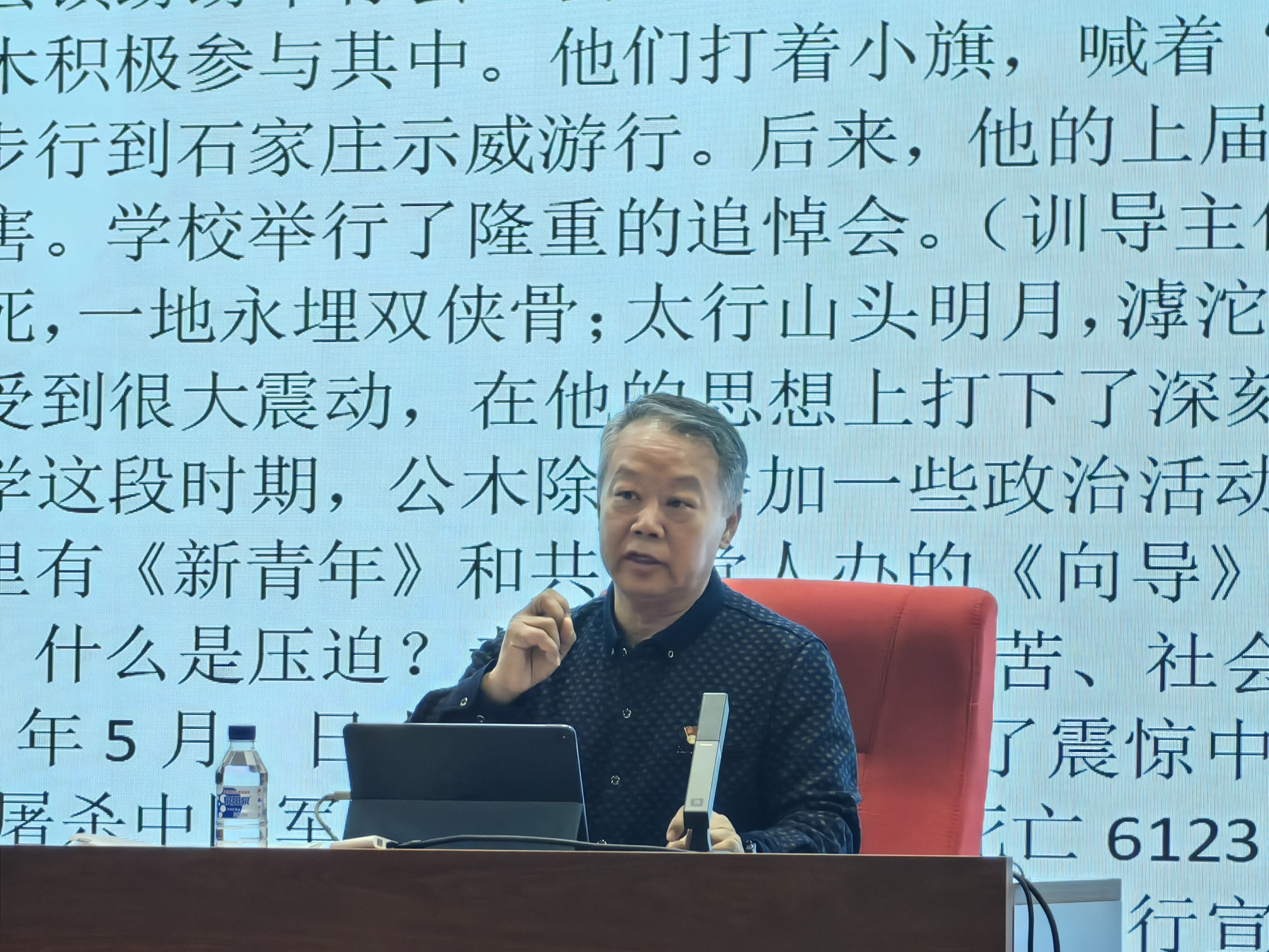 紧接着,邀请学院办公室张谦谦老师为王老师献花,表达对王老师精彩报告的敬意和对老一辈英雄传承的崇高敬意,全场师生致以最热烈的掌声。