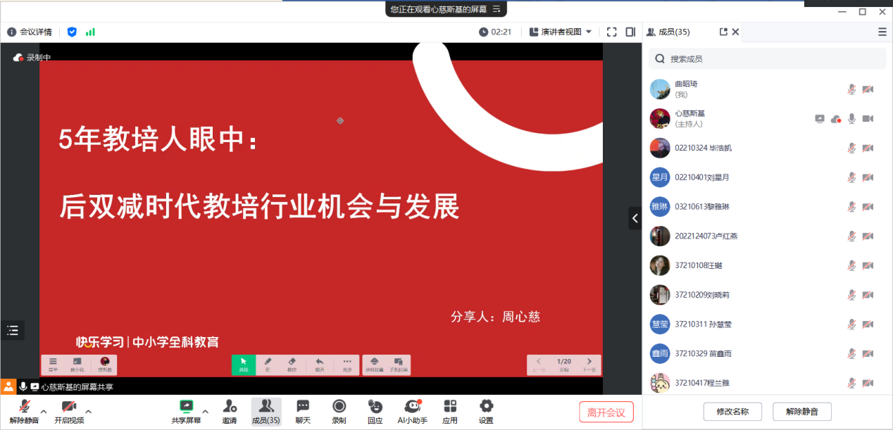 5月23日下午3时,“就”在文传系列实践报告会第二十九场《五年教培人眼中:后双减时代教培行业机会与发展》于腾讯会议上顺利召开。此次活动特邀快乐学习教育科技集团语文教研员、学习方法与家庭教育研究中心讲师,91制片厂