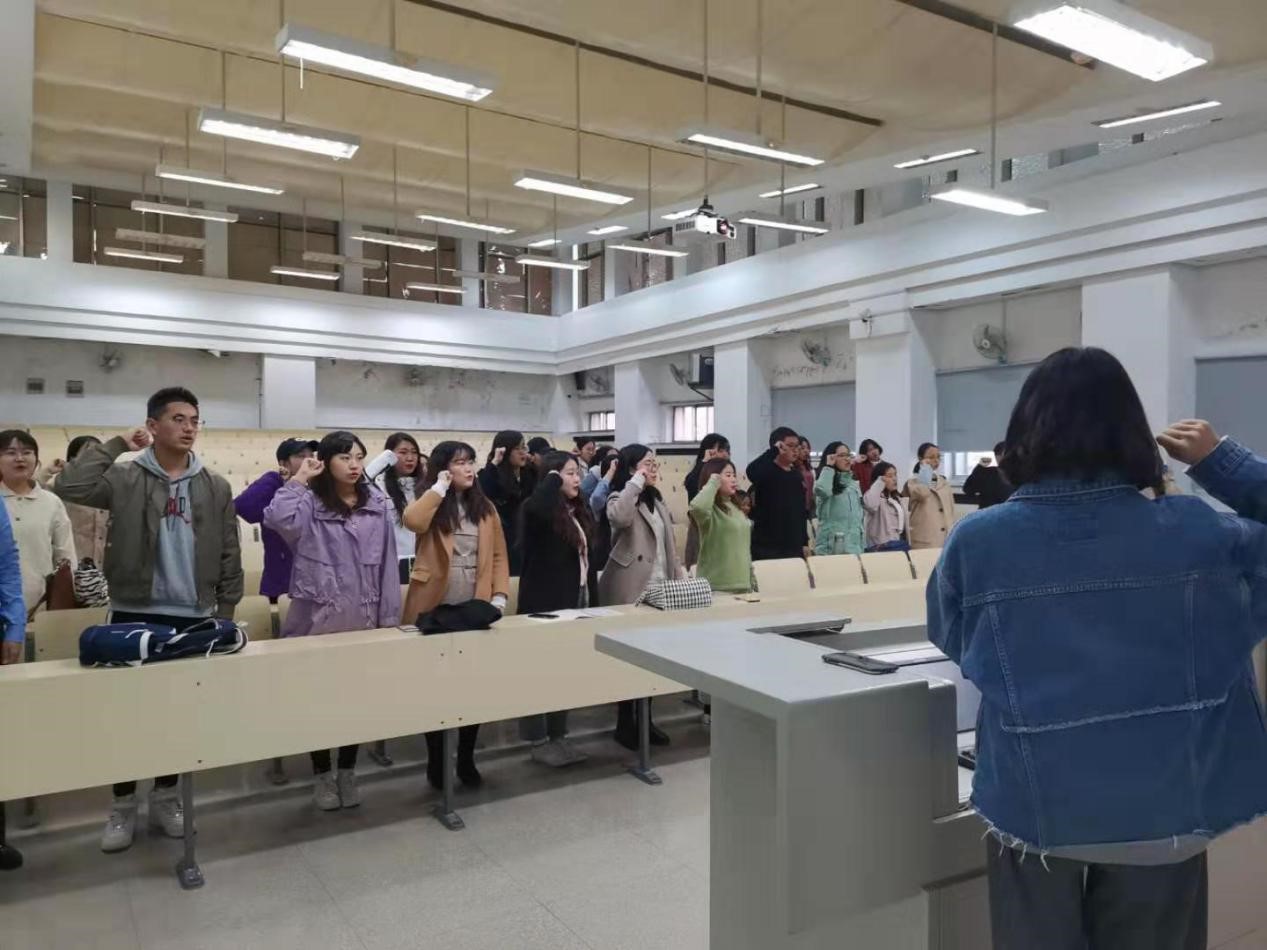 2019级第一、第三党支部在逸夫楼第十六阶梯教室举行了“不忘初心、牢记使命”主题教育特色系列活动之“永葆初心”——重温入党誓词活动。在第一支部党支书柳乔元的主持下,面对鲜红的党旗,全体党员庄严地举起右手,郑重宣誓。