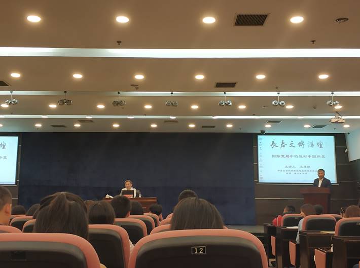 新生党员共同聆听了中国社会科学院近代史研究所所长王建朗教授题为《国际变局中的战时中国外交》的学术报告会。