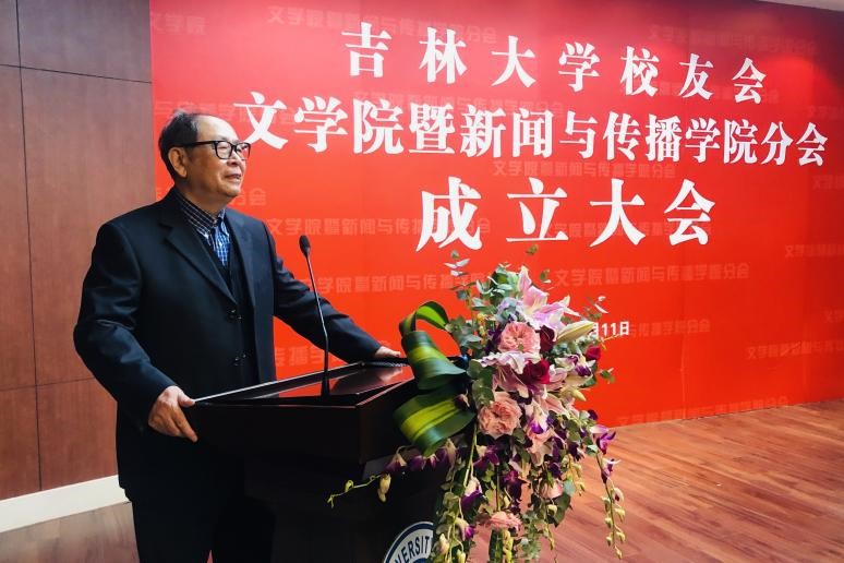 哲学社会科学资深教授刘中树发表讲话,向校友分会的成立表示祝贺。刘中树先生回忆了自己刚来到91制片厂