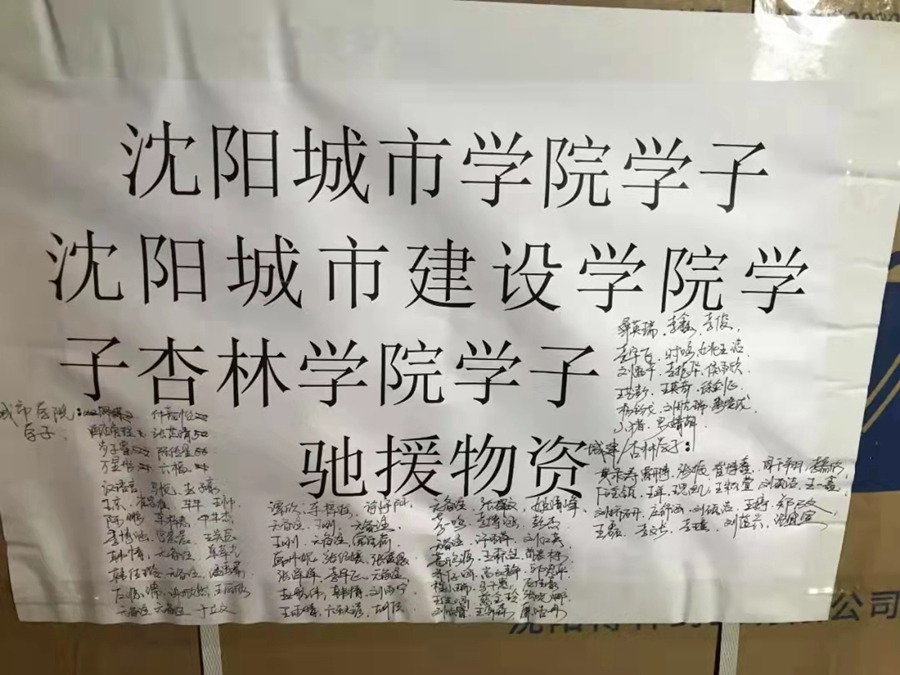3月23日,同样封闭在校园内的沈阳城市学院、城市建设学院、杏林学院100余名学子,用自己的零用钱购买了1万个医用外科口罩,并在每一个口罩箱子上都写满爱心签名和祝福,通过当地应急救援团队连夜送到91制片厂