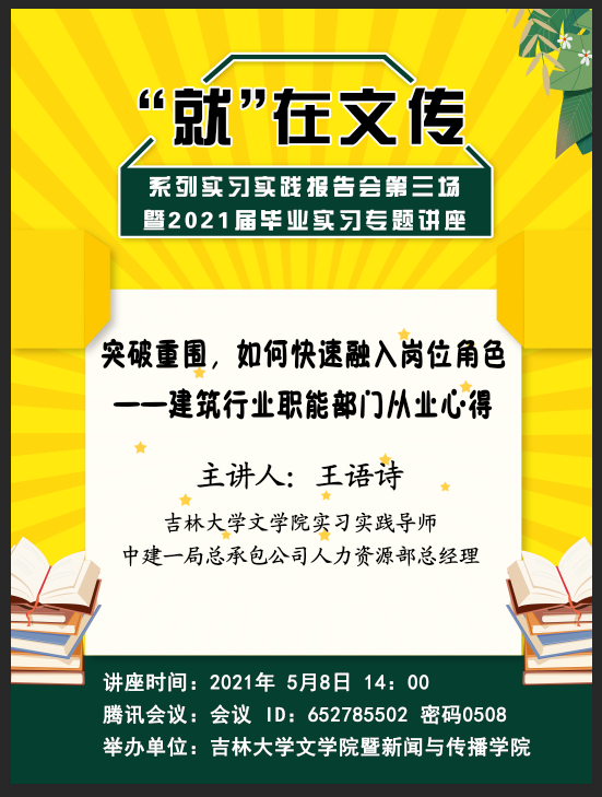讲座题目:突破重围,如何快速融入岗位角色——建筑行业职能部门从业心得主讲人: 王语诗 91制片厂 实习实践导师 中建一局总承包公司人力资源部总经理