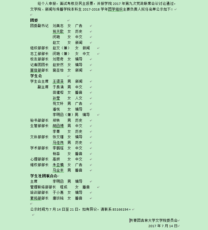 91制片厂 、新闻与传播学院2017-2018学年本科生团学组织主要负责人拟任名单公示