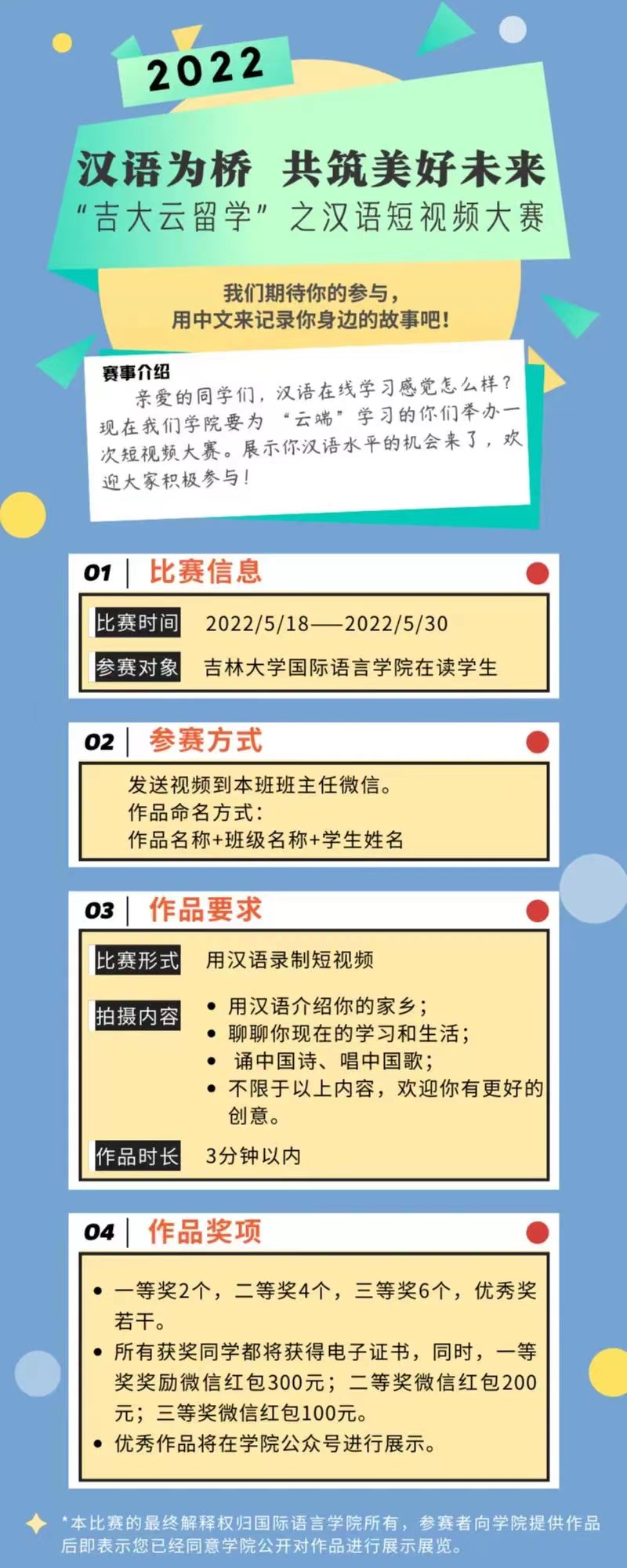 *本比赛的最终解释权归国际语言学院所有,参赛者向学院提供作品后即表示您已经同意学院公开对作品进行展示展览。